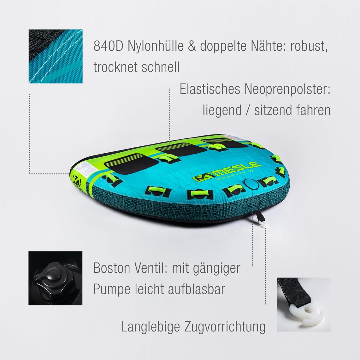 La bouée tractée Mesle Gravity est fabriquée à partir de matériaux haut de gamme garantissant durabilité et sécurité :